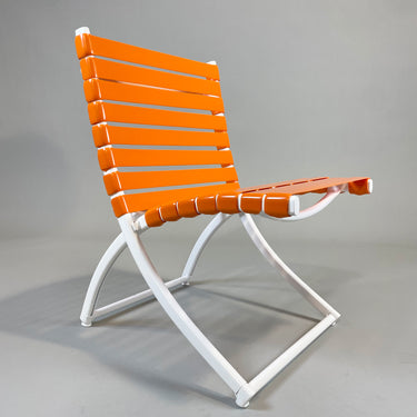 Refurbished Brown Jordan Folding Side Chair in White Finish Color, Orange Vinyl Strapping, Professionally Restored by CFR Patio to like-new condition.