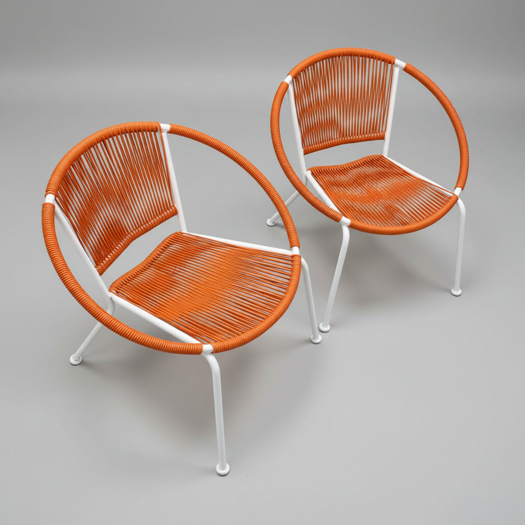 Retro style meets modern durability. This vintage outdoor chair features a Glossy White frame, Orange .22" vinyl cording, and weld cups on the feet for added protection. Inspired by the 70s/80s vinyl cord trend, it’s floating seat design perfect for outdoor lounging and conversation.