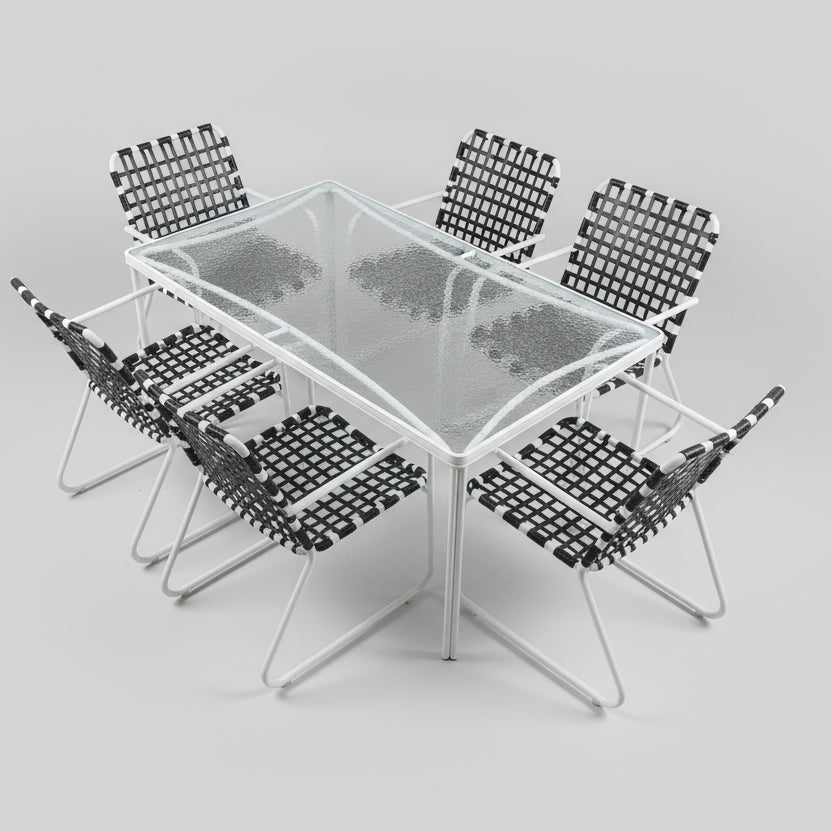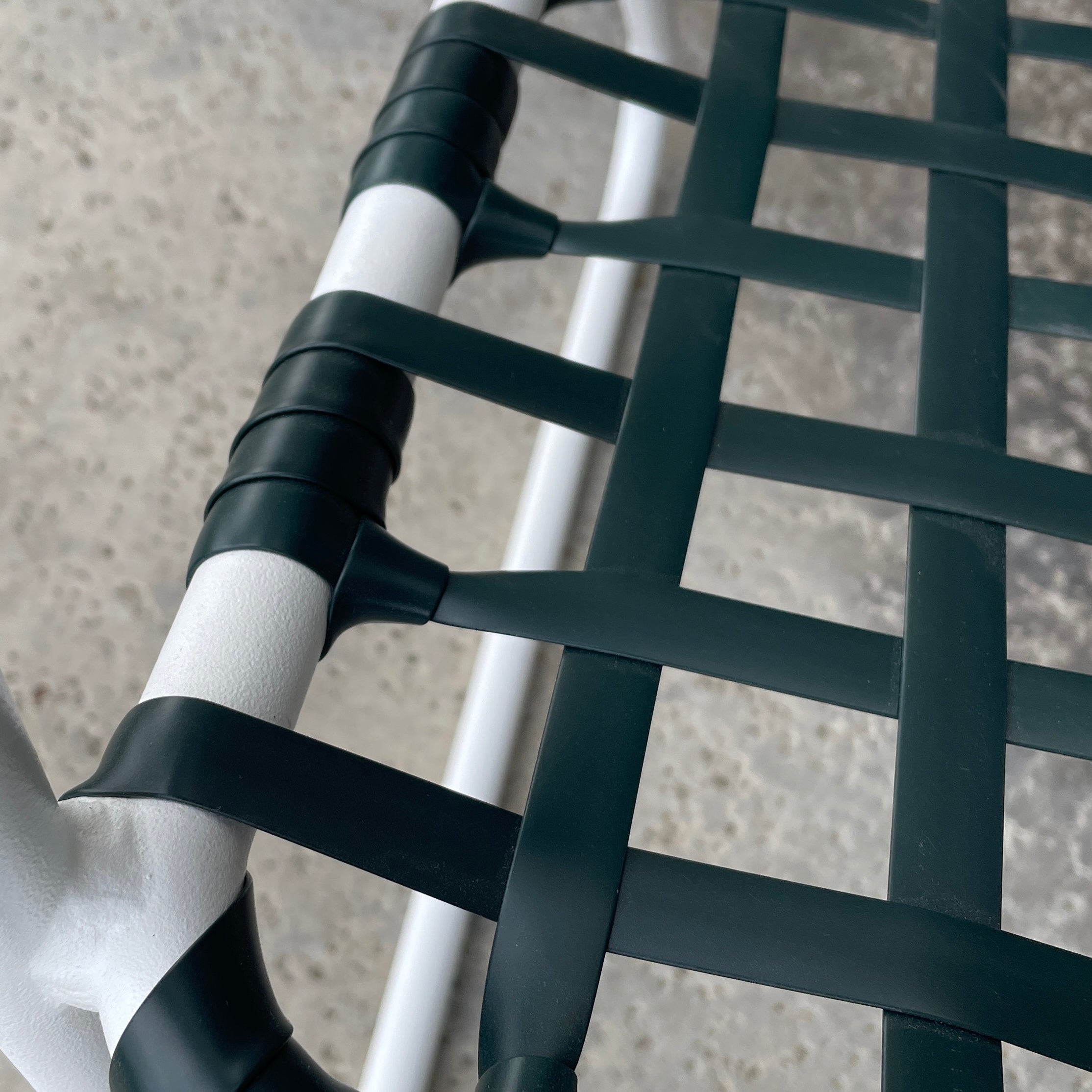 This dining set perfectly captures the spirit of mid-century Sun Fashion. Crafted from welded tubular aluminum, the frames are refinished in a fresh textured white and paired with new UV-resistant 5/8" Forest Green vinyl lacing in a square pattern. The design offers controlled elasticity for contoured, cushion-free comfort while maintaining a clean, architectural look. Built to withstand rain, sun, and salt air, this set is ideally suited for any outdoor environment.
