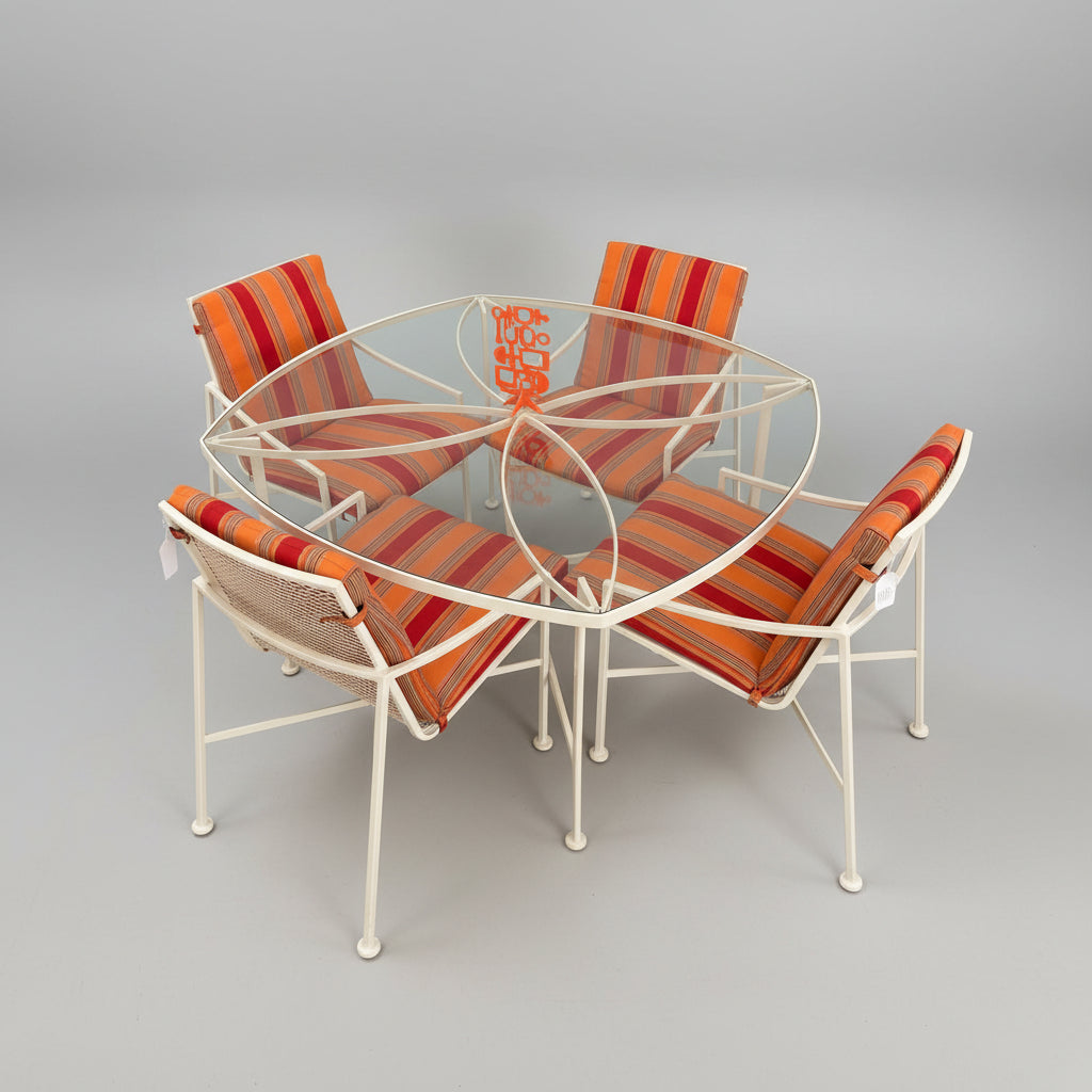 Add bold mid-century style to your patio with this rare Daisey all-metal dining set. Features a unique 1 of 1 48" flower-petal table, expanded metal chairs, UV-resistant off-white finish, and vibrant Sunbrella® Bravada Salsa custom cushions. Durable, comfortable, and one-of-a-kind.