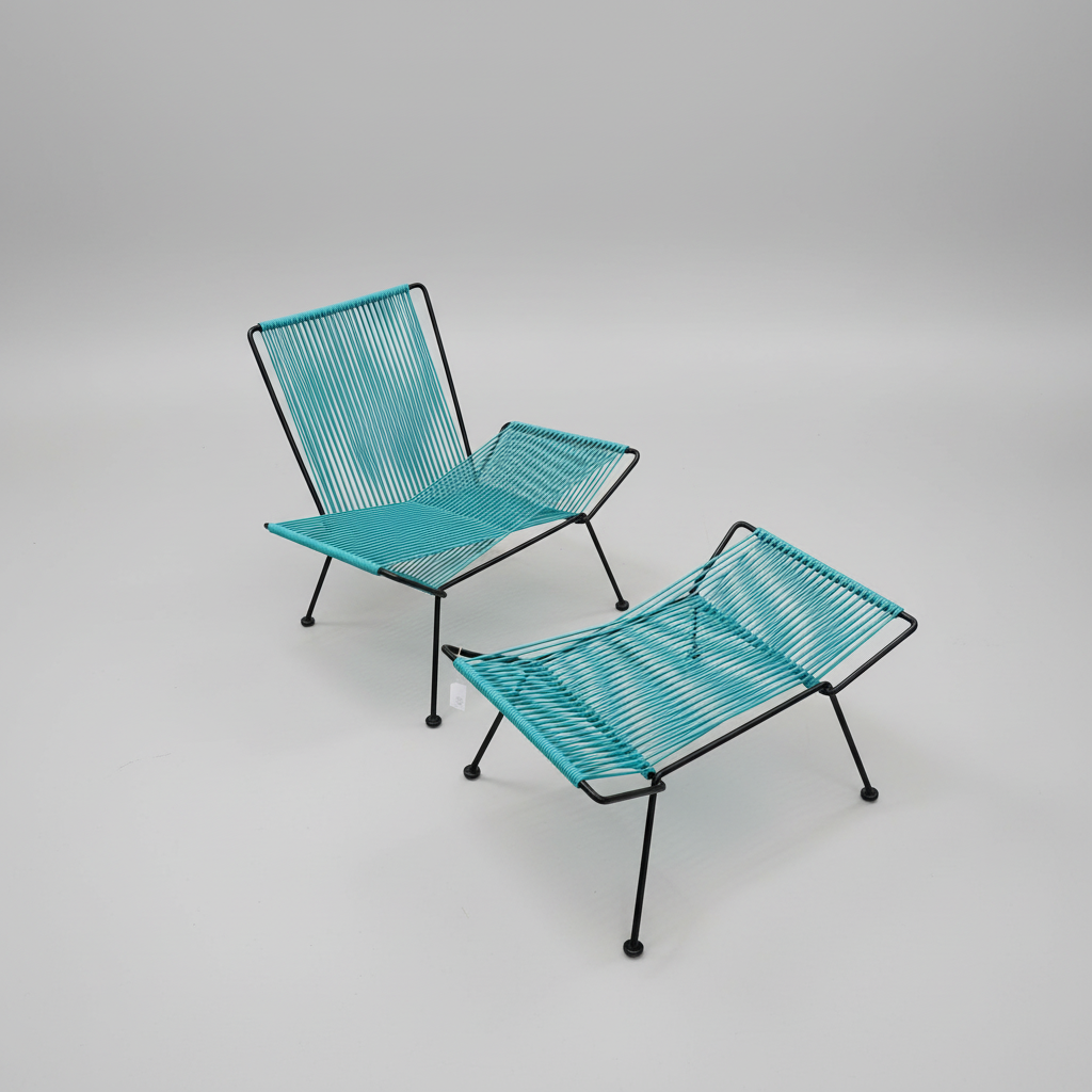The chair’s geometric wire frame and companion ottoman reflect that same design language—lightweight yet durable, visually striking yet comfortable. Restored and preserved, the set captures the spirit of mid-century experimentation while offering everyday usability.