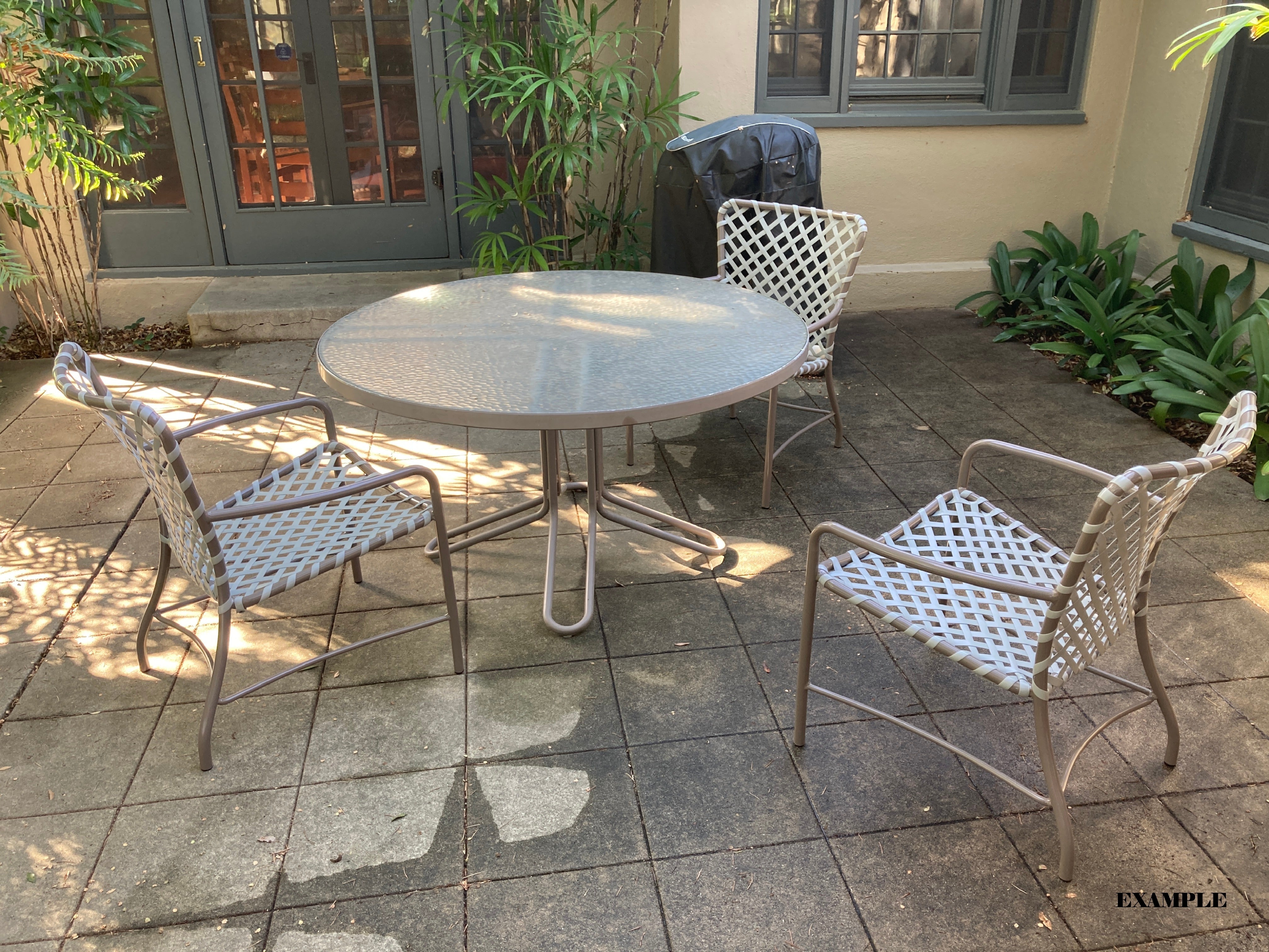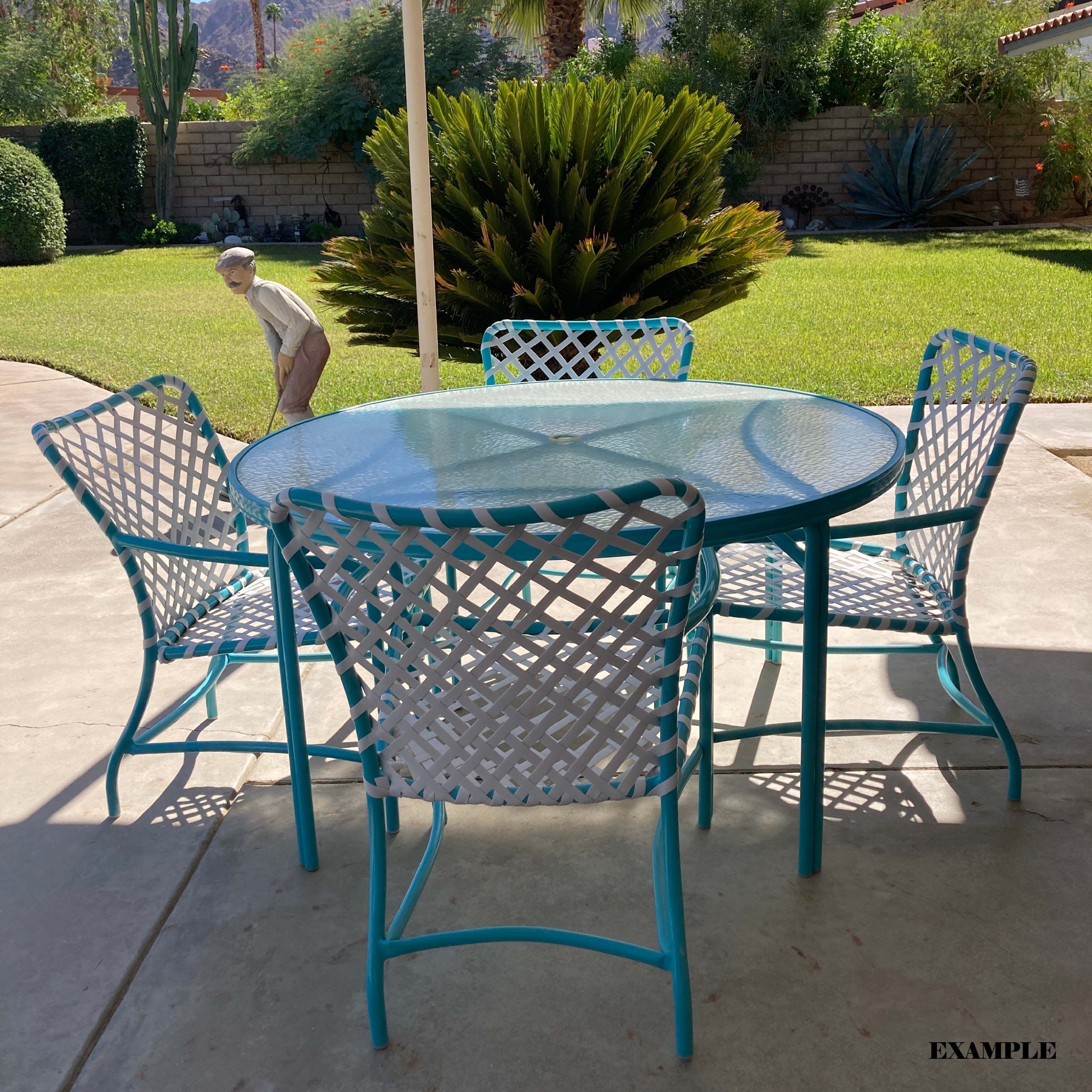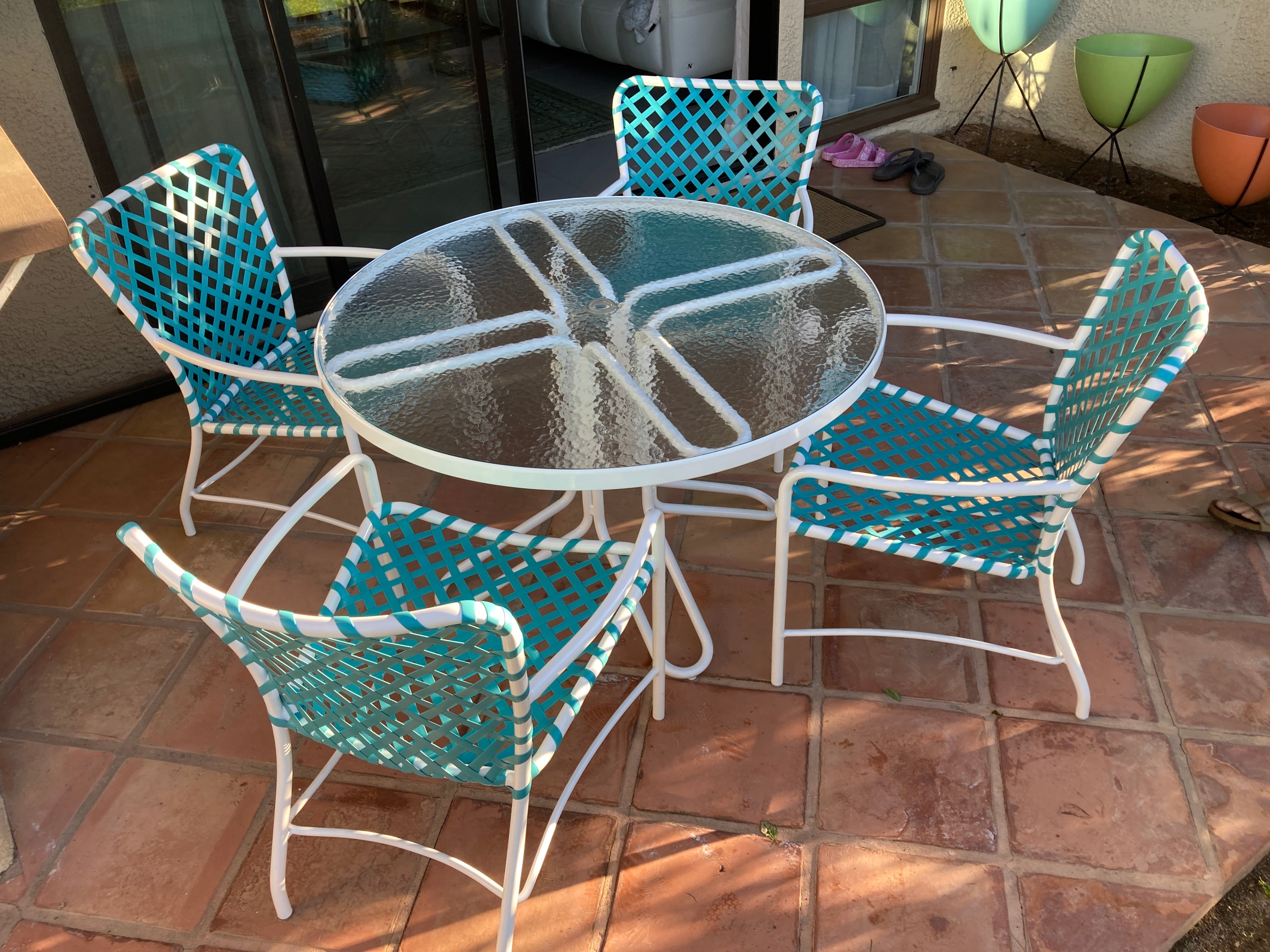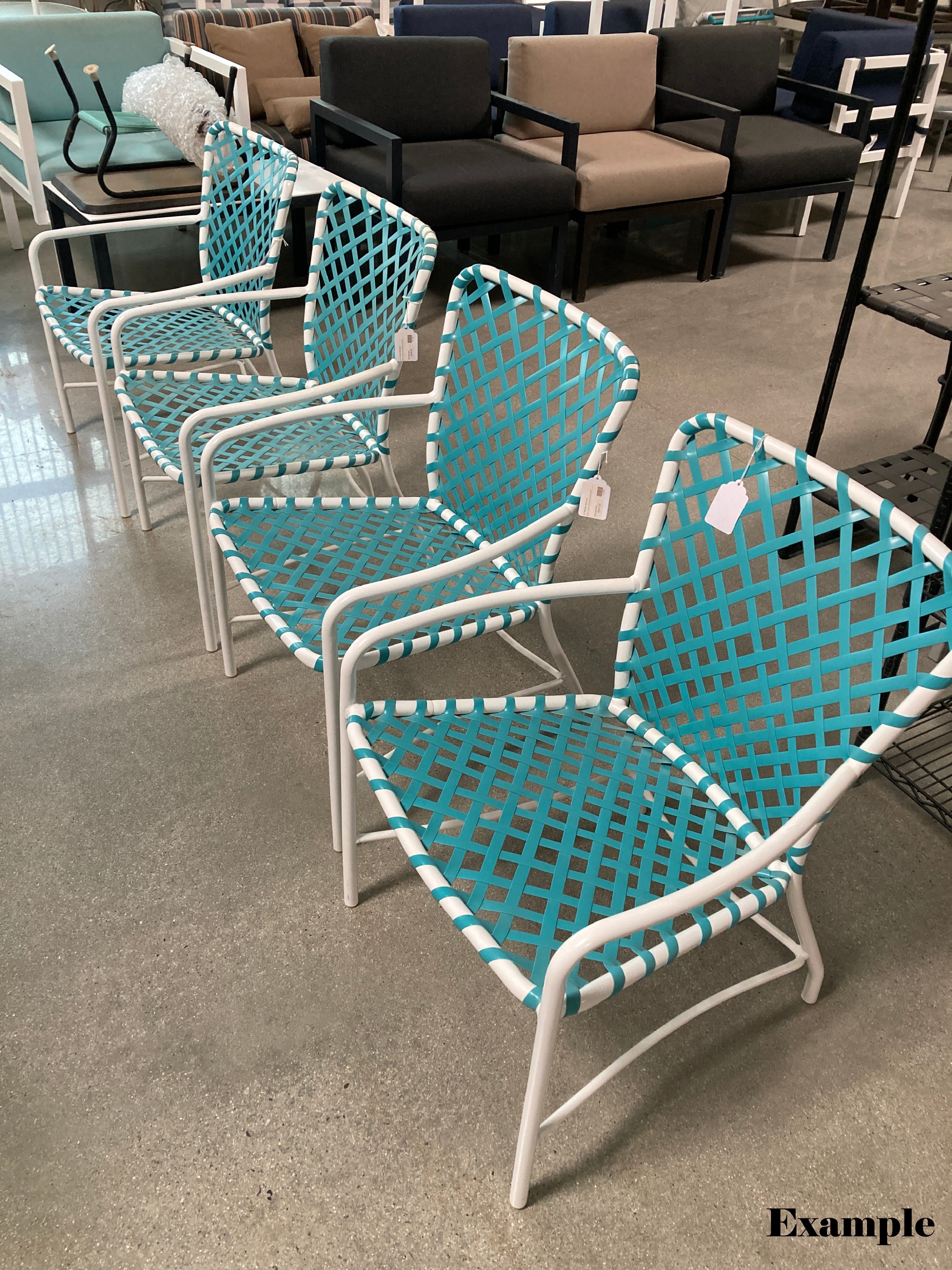 This dining arm chair features the classic tubular aluminum frame and woven vinyl lace seating that define the Tamiami line. The frame remains structurally sound and is offered as a custom restoration opportunity through CFR Patio’s factory. Professional powder coat refinishing and new 5/8" vinyl lace installation are available in your selected colors to restore the chair’s original appearance and comfort.
