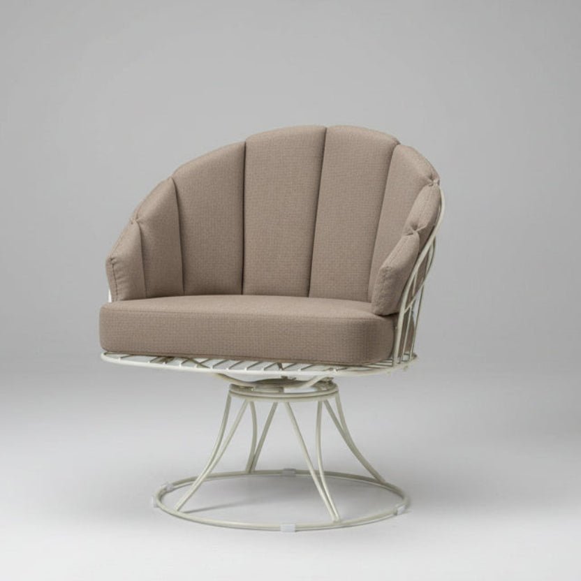 Each piece has been fully refinished in a soft Putty powder coat, creating a clean, versatile foundation that works beautifully in both modern and traditional outdoor settings. The barrel chairs are newly tailored with custom outdoor cushions in premium Outdura® fabric, engineered for fade resistance, durability, and lasting comfort season after season.